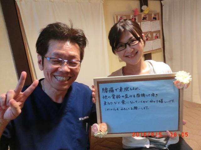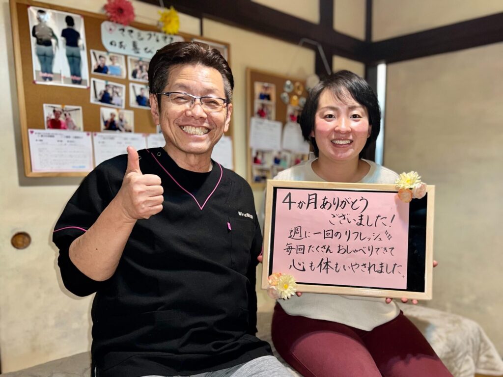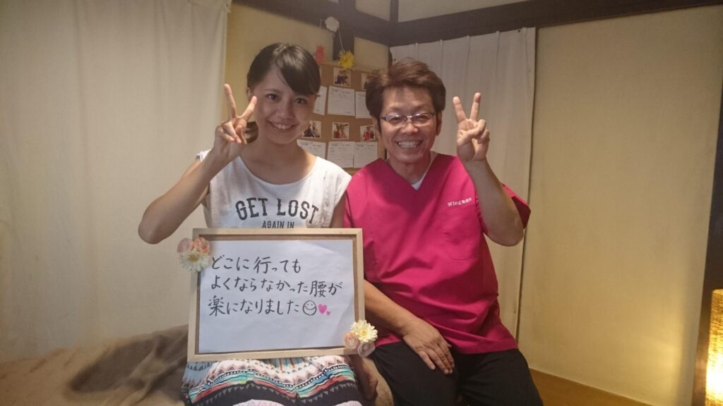 2年前に仕事中に腰椎ヘルニアで入院。医者からは早く手術しないと治らないと言われ途方にくれてましたが、wing整体院で毎週施術を受けてから徐々に歩けるようになり仕事も復帰できました!まさに神の手です!