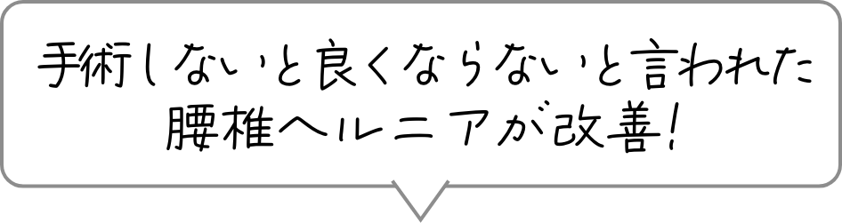 堤先生は、施術の腕の良さだけでなく、本当に良くしたいという思いやりを施術する度に感じます。椎間板ヘルニアや難治腰痛でお悩みの方にオススメです!